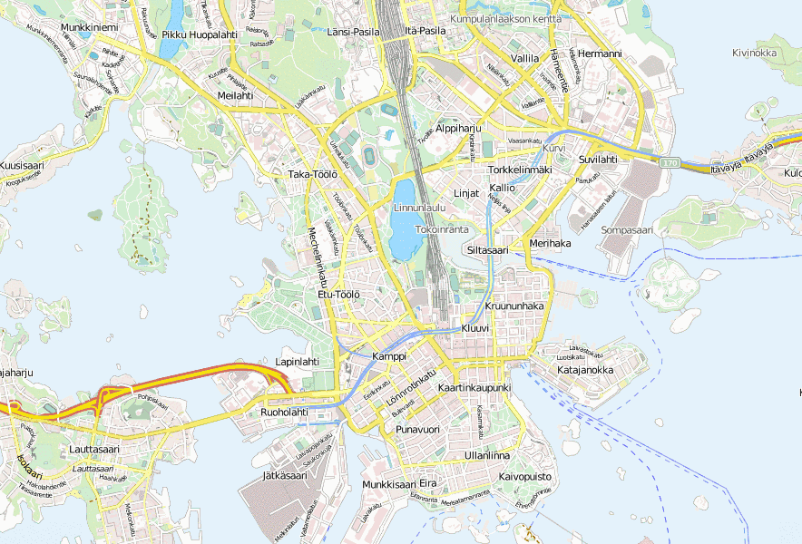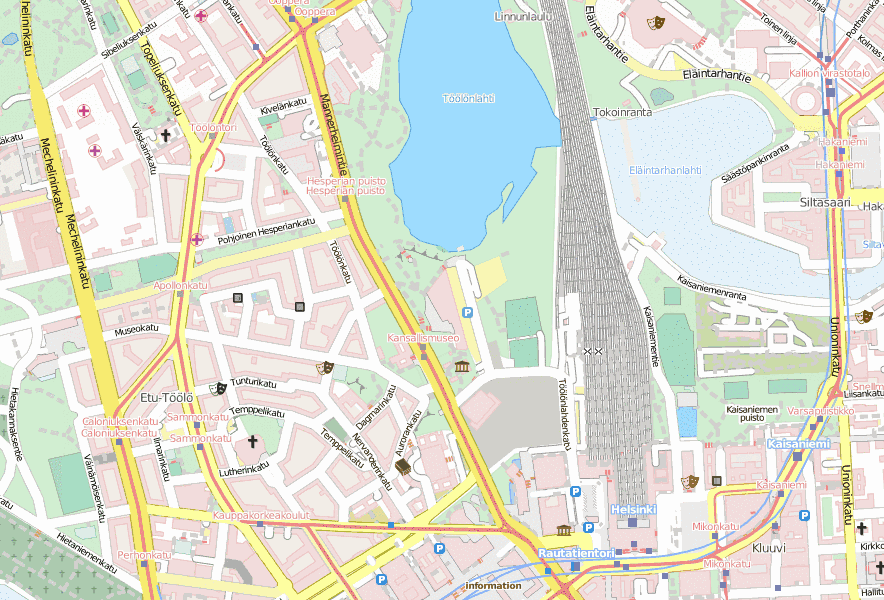Nicht weit entfernt findet man schöne Sehenswürdigkeiten wie beispielsweise Nationalmuseum, Parlament oder Finlandia-Halle. Passend sind folgende Landkarten: Präsidentenpalais, Nationalgalerie Ateneum, Esplanadi und Helsinki Dom